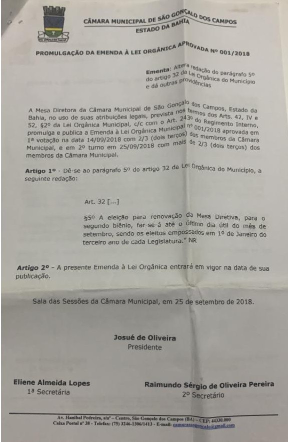 O vereador da cidade de São Gonçalo dos Campos, Gilson Cazumbá (Solidariedade), está acusando o presidente da Câmara Municipal da cidade de não dar publicidade ao edital de inscrição para as chapas que concorrerão a presidência. Segundo Gilson, o edital foi feito enquanto a Casa estava ainda em recesso. No dia 15 de fevereiro, no retorno das atividades legislativas, Gilson disse que foi publicado no Diário Oficial o edital para as inscrições da chapa, mas ele não consta no site oficial do órgão.