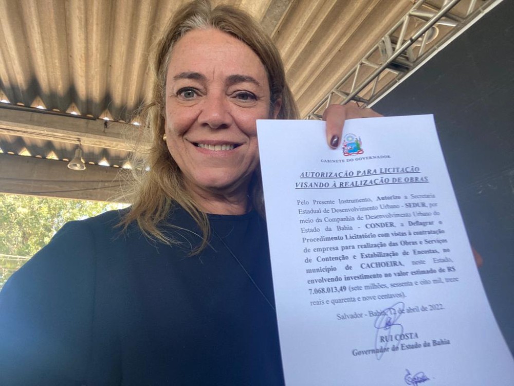 A prefeita da cidade de Cachoeira, Eliana Gonzaga (Republicanos) foi até a cidade de Salvador nesta terça-feira (11) com uma comitiva de moradores da cidade. São moradores do Alto da Rodagem, do Genipapeiro e da Matinha. A comitiva tem mais de 50 pessoas. “Estamos indo ao encontro do governador Rui Costa e a sua comitiva, no Parque de Exposições, para dar ordem de serviço a construção de encostas no Alto da Rodagem, uma encosta do Colégio Estadual da Cachoeira e outra no Alto da Matinha. São três grandes obras que estaremos recebendo hoje para a população cachoeirana”, afirmou a prefeita. São mais de R$ 7 milhões em investimentos.