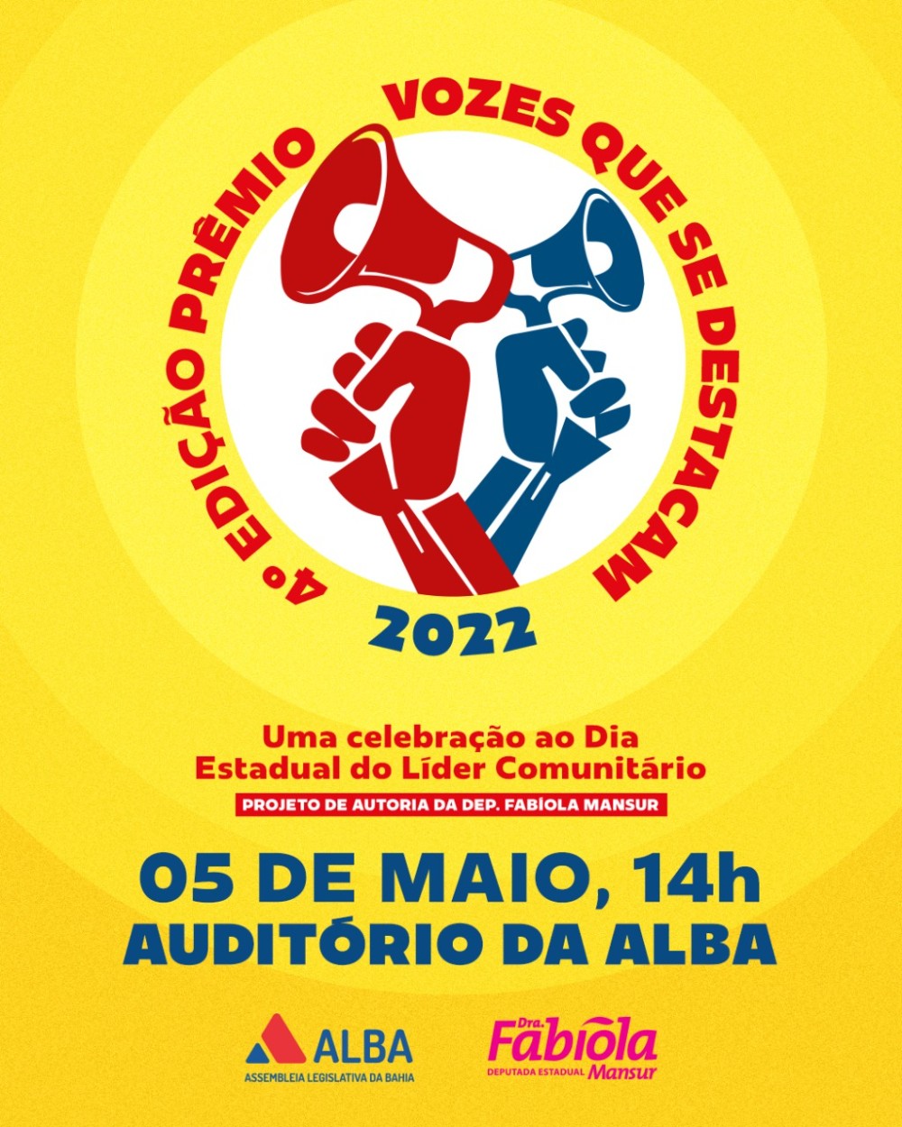 Em comemoração ao Dia Estadual do Líder Comunitário, a deputada estadual Fabíola Mansur promove evento especial, nesta quinta-feira, 5 de maio, às 14h, no Auditório Jornalista Jorge Calmon, na Assembleia Legislativa da Bahia.