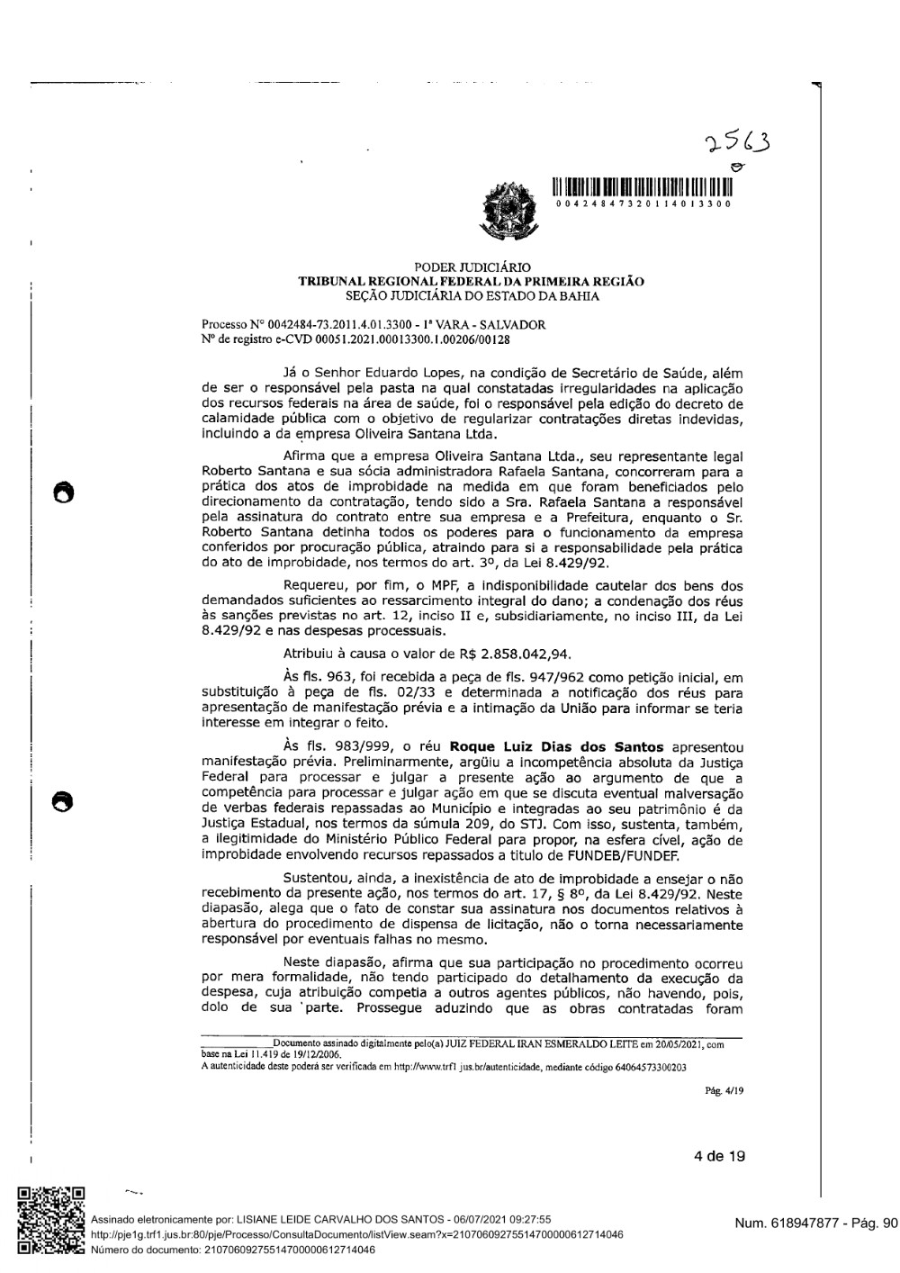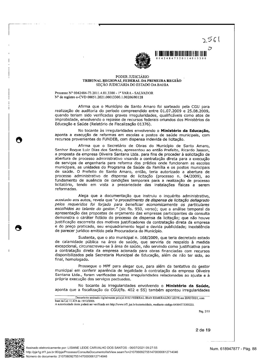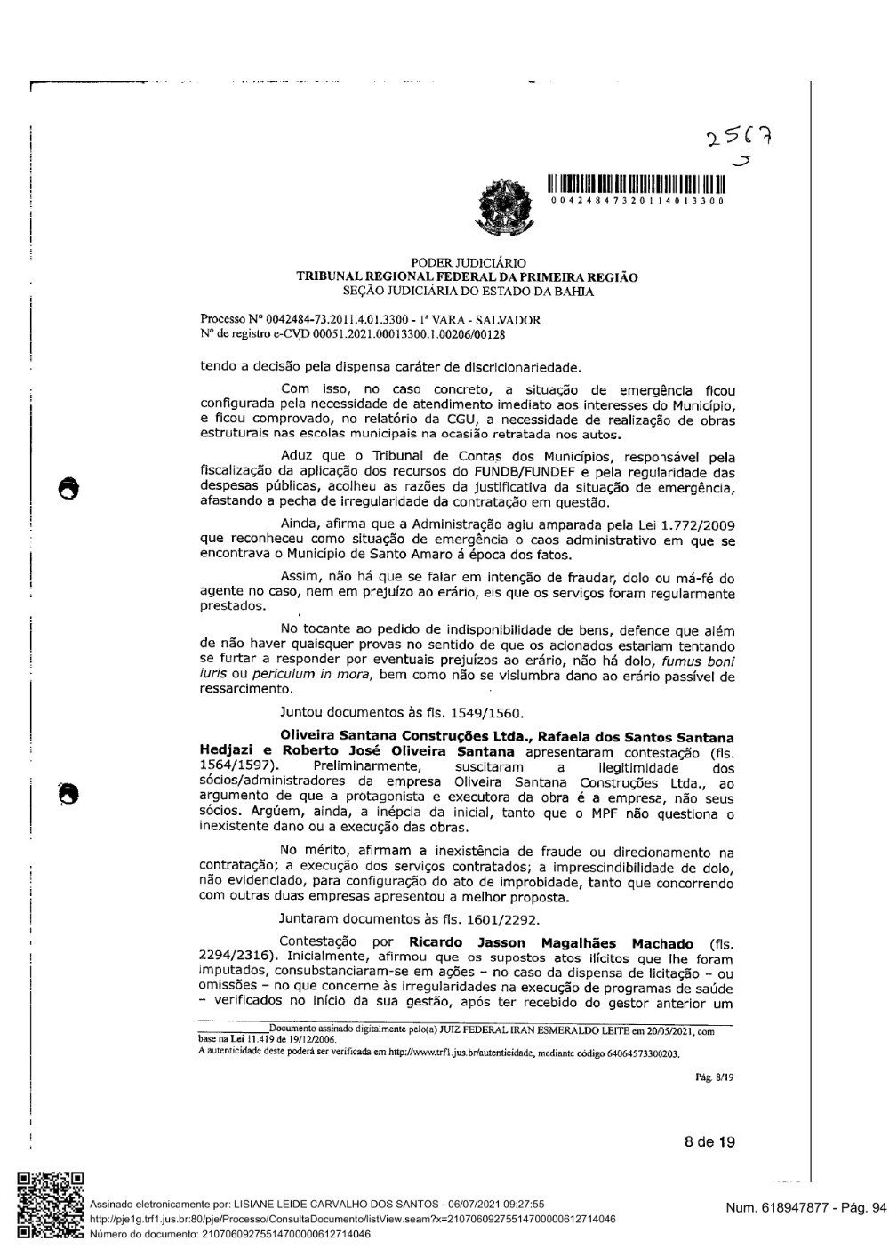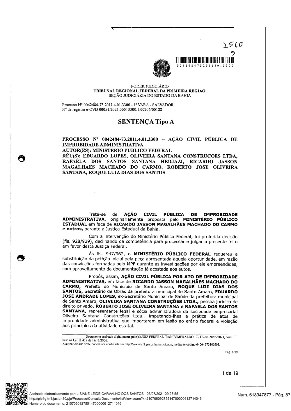 Mais uma denúncia contra o ex-prefeito de Santo Amaro da Purificação, Ricardo Machado, foi arquivada pela Justiça. Trata-se da Ação Civil Pública de Improbidade Administrativa proposta pelo Ministério Público Federal sobre “graves irregularidades, qualificáveis como atos de improbidade envolvendo o repasse de recursos federais oriundos dos Ministério da Educação e Saúde. O juiz Iran Esmeraldo Leite, em auxílio a 1ª Vara, julgou como improcedente o pedido de reconhecendo a ilegitimidade passiva.