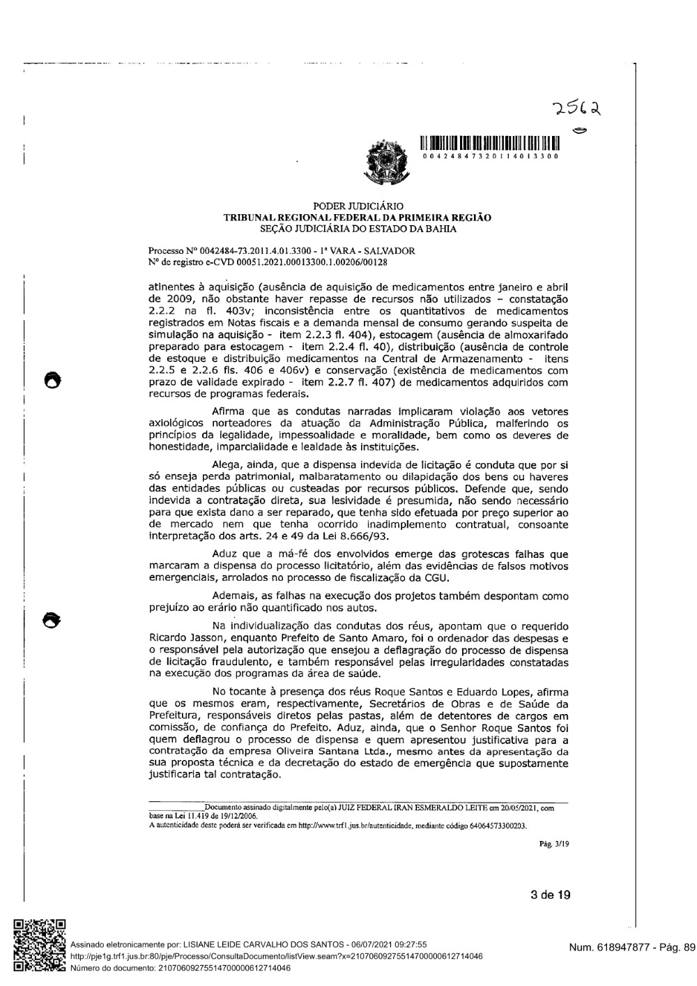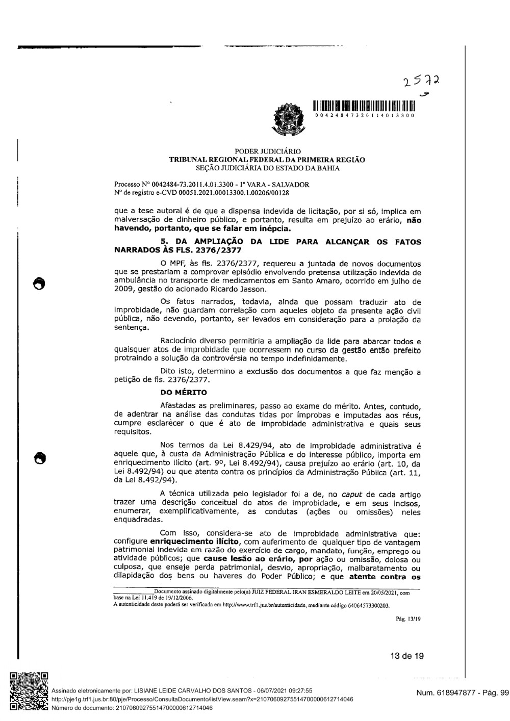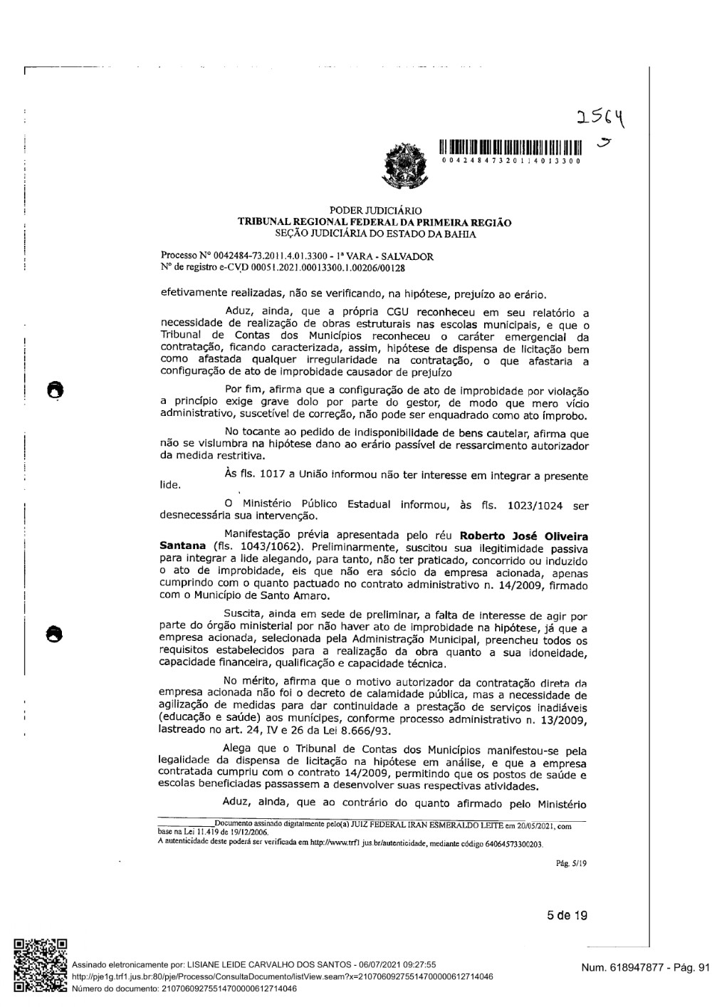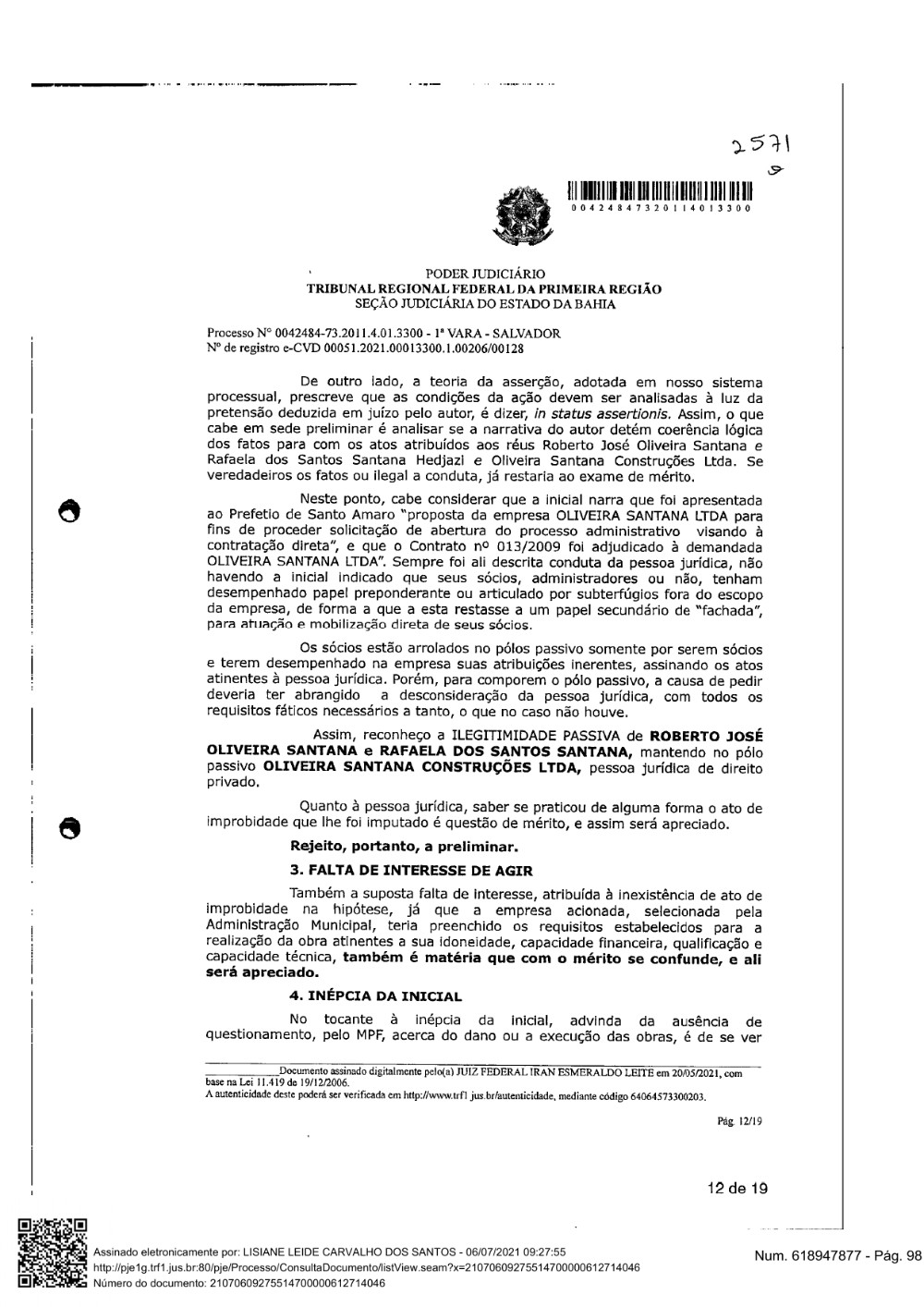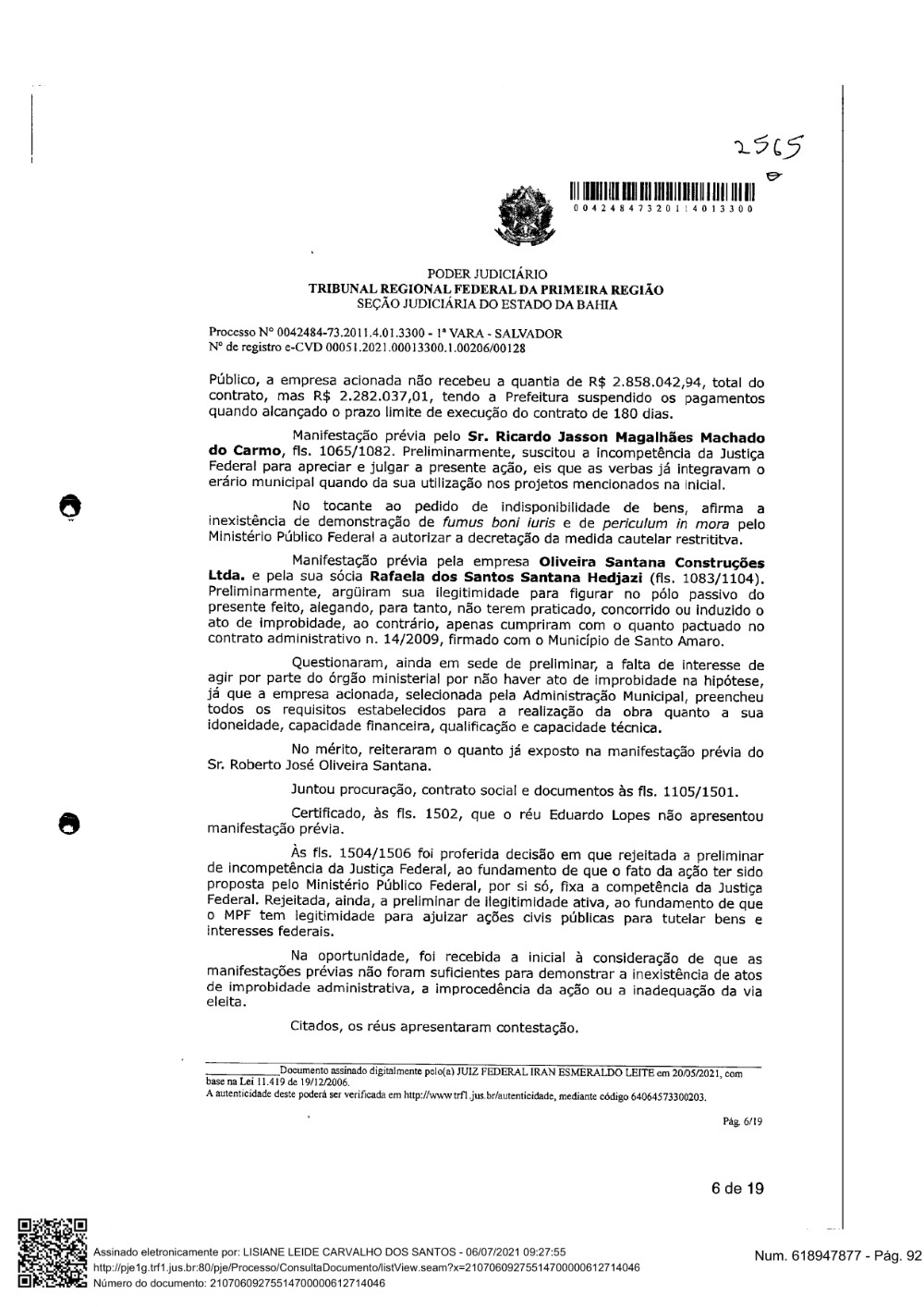 Mais uma denúncia contra o ex-prefeito de Santo Amaro da Purificação, Ricardo Machado, foi arquivada pela Justiça. Trata-se da Ação Civil Pública de Improbidade Administrativa proposta pelo Ministério Público Federal sobre “graves irregularidades, qualificáveis como atos de improbidade envolvendo o repasse de recursos federais oriundos dos Ministério da Educação e Saúde. O juiz Iran Esmeraldo Leite, em auxílio a 1ª Vara, julgou como improcedente o pedido de reconhecendo a ilegitimidade passiva.