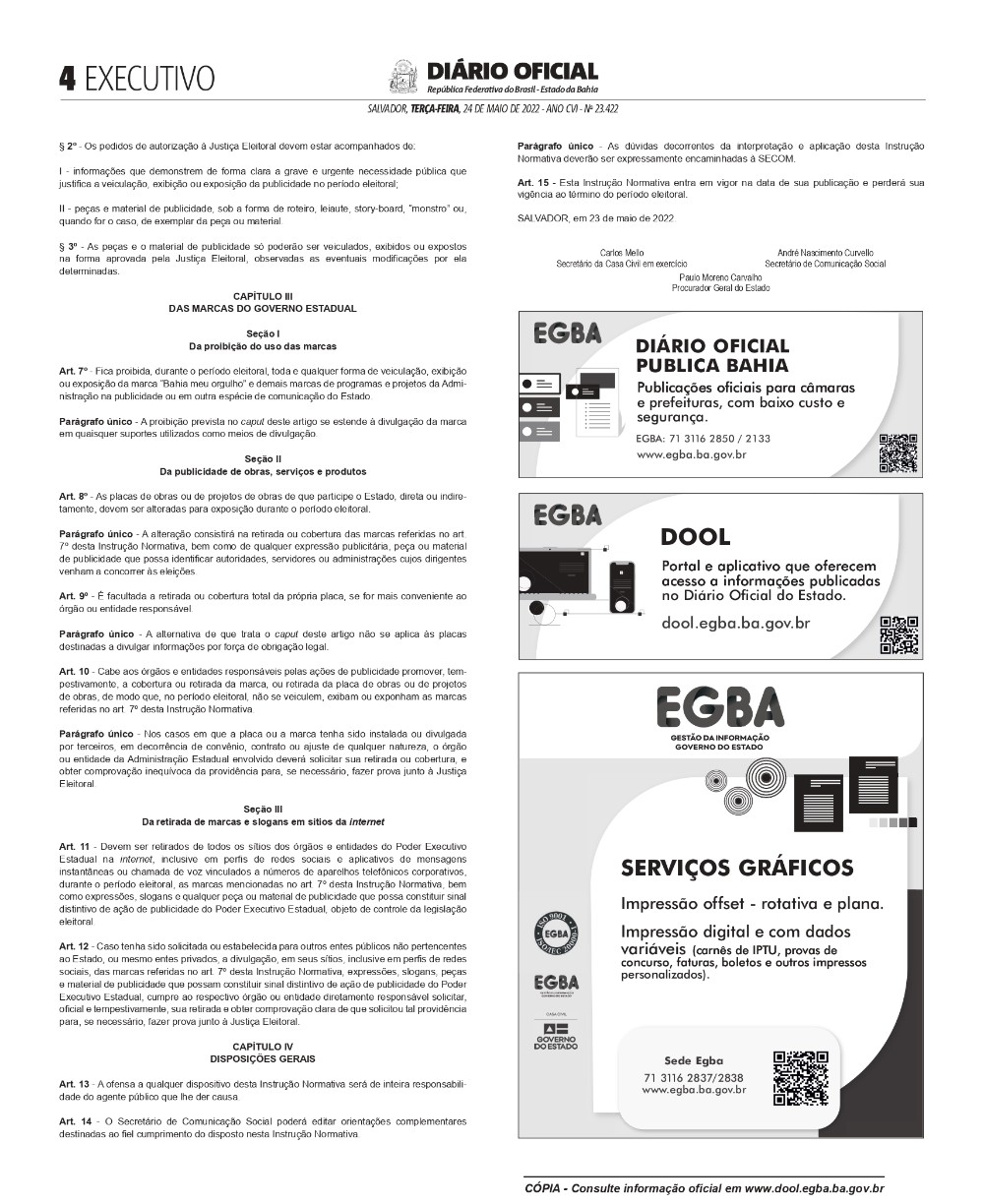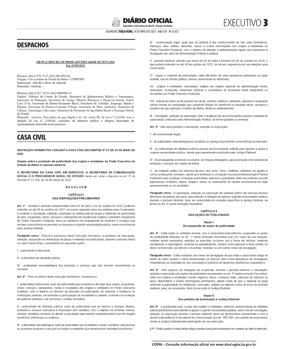 Veja a Instrução Normativa Conjunta Casa Civil/SECOM/PGE Nº 01 De 23 de maio de 2022 abaixo.