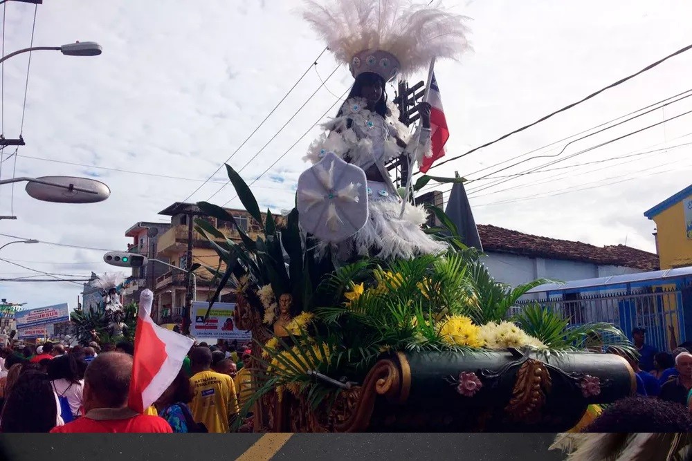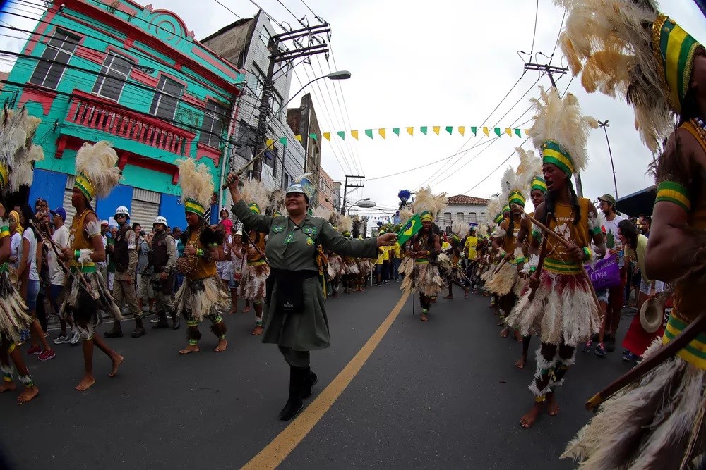 As figuras do Caboclo e da Cabocla, que representam os indígenas que lutaram contra a presença dos colonizadores portugueses na cidade, lideram o cortejo.