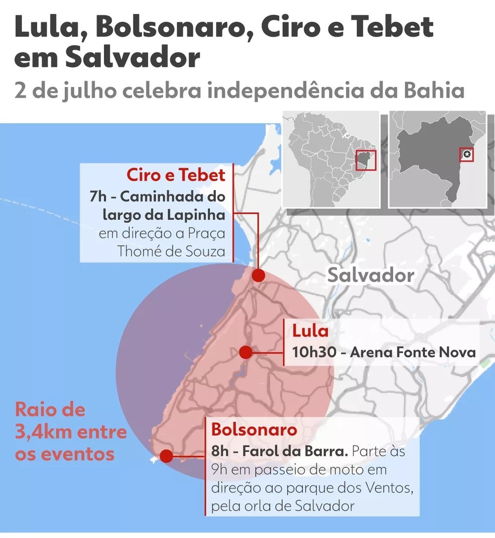 Lula, Ciro e Tebet devem participar do desfile cívico, a "caminhada do 2 de Julho", que começa no início da manhã. Ciro deve caminhar ao lado de uma comitiva do PDT - na Bahia, o partido integra a base do ex-prefeito de Salvador ACM Neto.