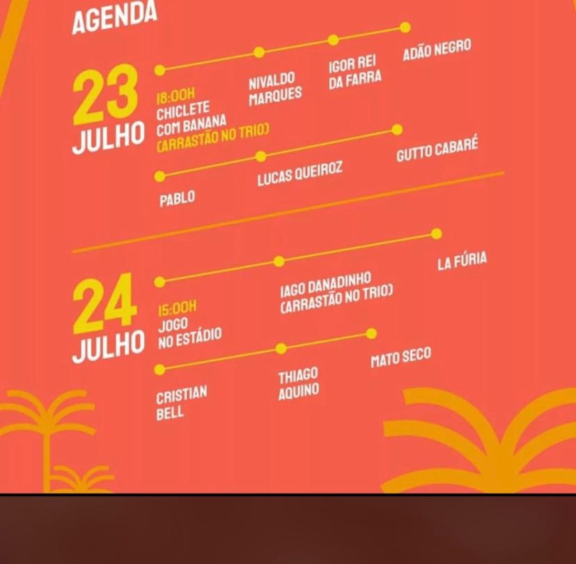 A festa contará como Chiclete com Banana, Nivaldo Marques, Adão Negro, Igor Rei da Farra, Pablo, Lucas Queiroz, Gutto Cabaré, Iago Danadinho, La Fúria, Cristian Bell, Thiago Aquino, Mato Seco como atrações e ainda um jogo de futebol no estádio municipal.