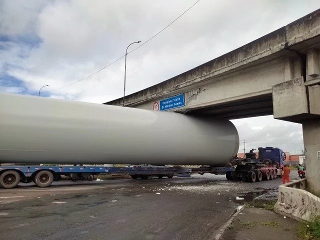 Na manhã da última quarta-feira (20), uma carreta que transportava uma torre eólica ficou presa embaixo de um dos viadutos. O acidente acabou afetando a estrutura de um dos viadutos.
