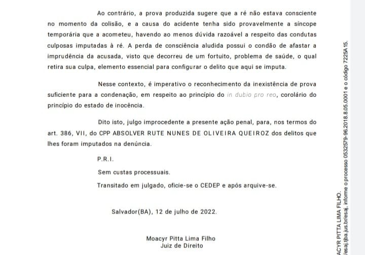 O juiz Moacyr Pitta justificou sua decisão, ainda, afirmando que a perda de consciência da médica Rute Queiroz afastou a imprudência dela no momento do acidente, uma vez que decorreu de um fortuito, problema de saúde, o qual retirou sua culpa.