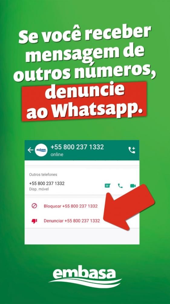 Salen disse que estão tentando aplicar golpe nos usuários pelo WhatsApp, simulando pagamento de contas com PIX e outras formas de pagamento. "Reforçamos que o WhatsApp da Embasa é o número (71) 99717-0999. As únicas exceções que eu quero frisar aqui são números de telefones fixos em cidades menores no entorno de Feira de Santana que ainda utilizamos como WhatsApp de suporte para atendimento", explica.