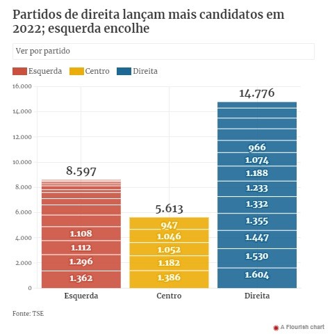 Dos 28,9 mil candidatos que estarão nas urnas em 2 de outubro, 20.389 são de direita ou centro; em 2018, esse número foi de 18.672. O PL, do presidente Jair Bolsonaro, é a sigla com mais postulantes: 1.604. Em seguida, estão União Brasil, com 1.530, e Republicanos, com 1.447.