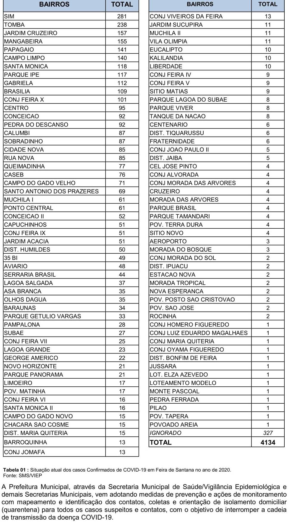 Os dez bairros que registram mais casos de exames positivos para Covid-19 em Feira de Santana concentram 37,92% de todos os casos no município. O balanço do número de casos por localidades foi divulgado pela Vigilância Epidemiológica, da Secretaria Municipal de Saúde, na noite desta sexta-feira, 03.