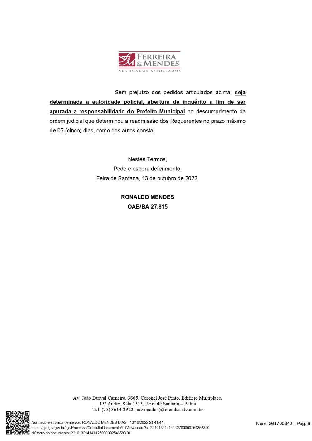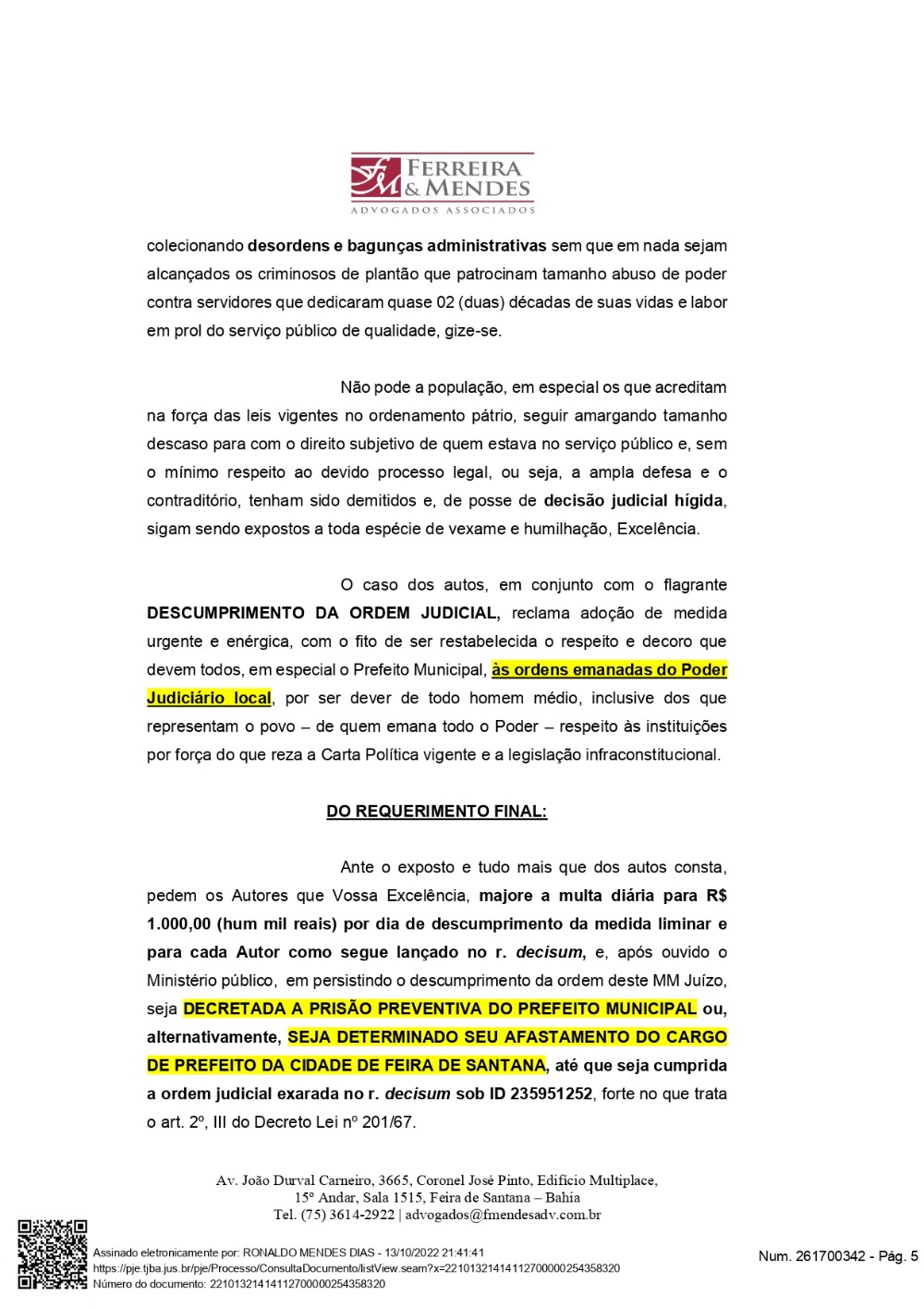 “A forma que achamos para forçar o prefeito a respeitar a lei, a decisão do juiz, foi pedir aquilo que ela autoriza: o pedido de afastamento e a sua prisão preventiva. É uma medida drástica, ninguém está feliz com isso, mas as pessoas não podem ficar em casa sem dinheiro para comprar comida e pagar aluguel, quando eram servidores que fizeram concurso e estavam afastados sem processo administrativo, que é outra arbitrariedade do prefeito de Feira de Santana”.