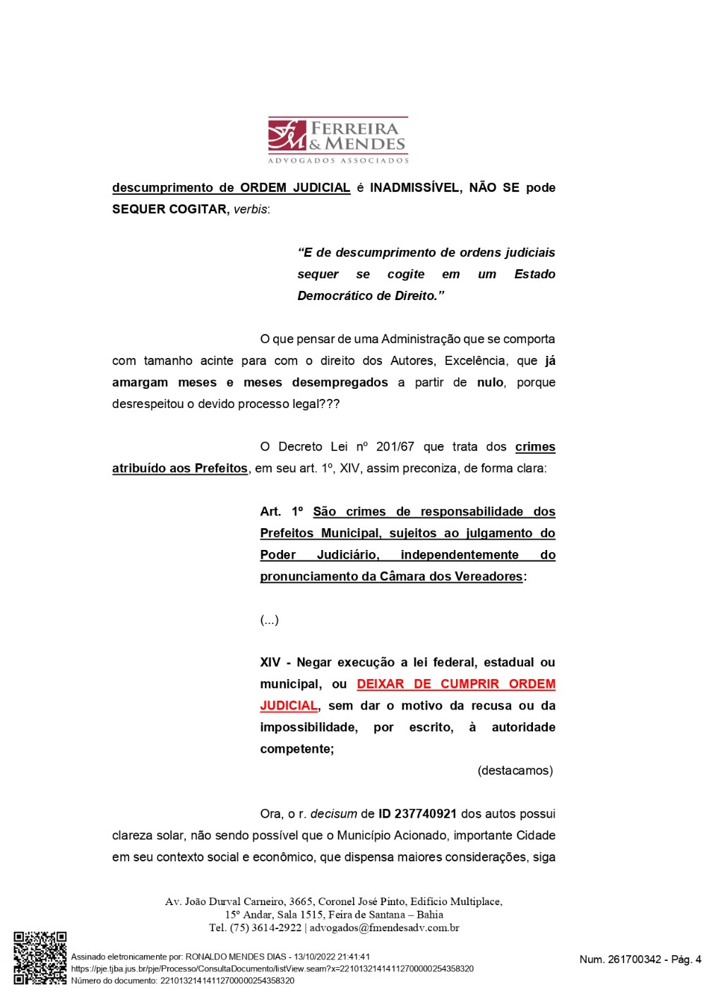 Essa atitude do prefeito, ressalta o advogado, despreza a determinação de reintegração dos profissionais afastados e que já trabalhavam há até 15 anos. “Isso é grave porque o decreto 201/67 define os crimes do prefeito e entre eles diz que descumprir ordem judicial está passível a afastamento do cargo e até a prisão preventiva, independente do pronunciamento da Câmara de Vereadores da cidade”.