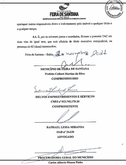 Em contrapartida, o Colégio Helyos assumiria o compromisso de custear, em parceria com a Prefeitura Municipal, obra de urbanização da Lagoa do Subaé. O TAC foi assinado em 22 de novembro de 2021 pelo prefeito Colbert Martins; representantes do Colégio Helyos; o procurador Geral do Município à época, Carlos Alberto Moura Pinho, além dos secretários municipais da Sedur, Sérgio Carneiro, e Meio Ambiente à época, José Carneiro Rocha. O documento está registrado em cartório.