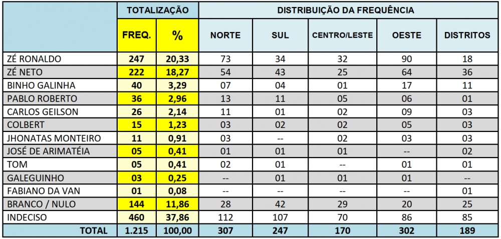 A pesquisa mostrou ainda que a eleição muito provavelmente ficará polarizada entre os nomes do ex-prefeito e do deputado federal pelo PT, Zé Neto. A diferença é que, enquanto Ronaldo é forte na sede do município, Zé Neto é mais forte nos distritos. Na pesquisa espontânea, ou seja, quando não é informado o nome, os possíveis candidatos tiveram um aumento no percentual de votos. Zé Ronaldo ficou com 20,33% e Zé Neto com 18,27%.
