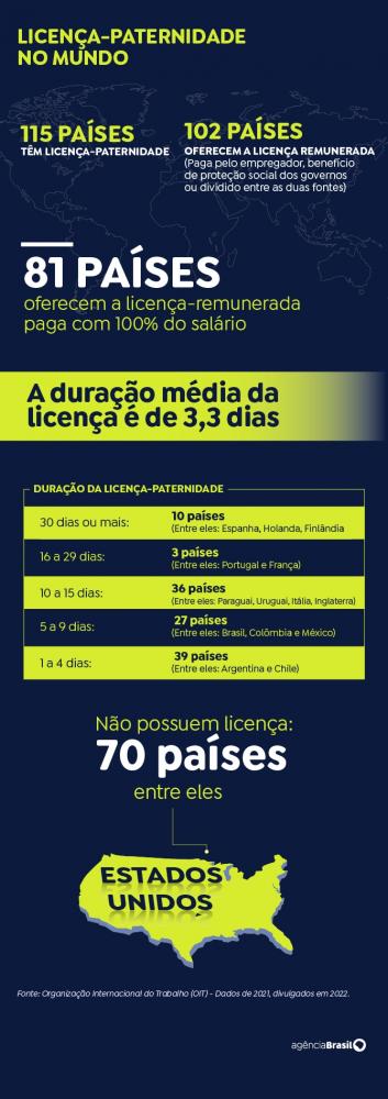 De acordo com a Organização Internacional do Trabalho (OIT), a licença-paternidade existe em 115 países e é remunerada em 102. O custeio é feito com recursos do empregador, benefícios de proteção social dos governos ou dividido entre as duas fontes. A duração média da licença é de 3,3 dias.