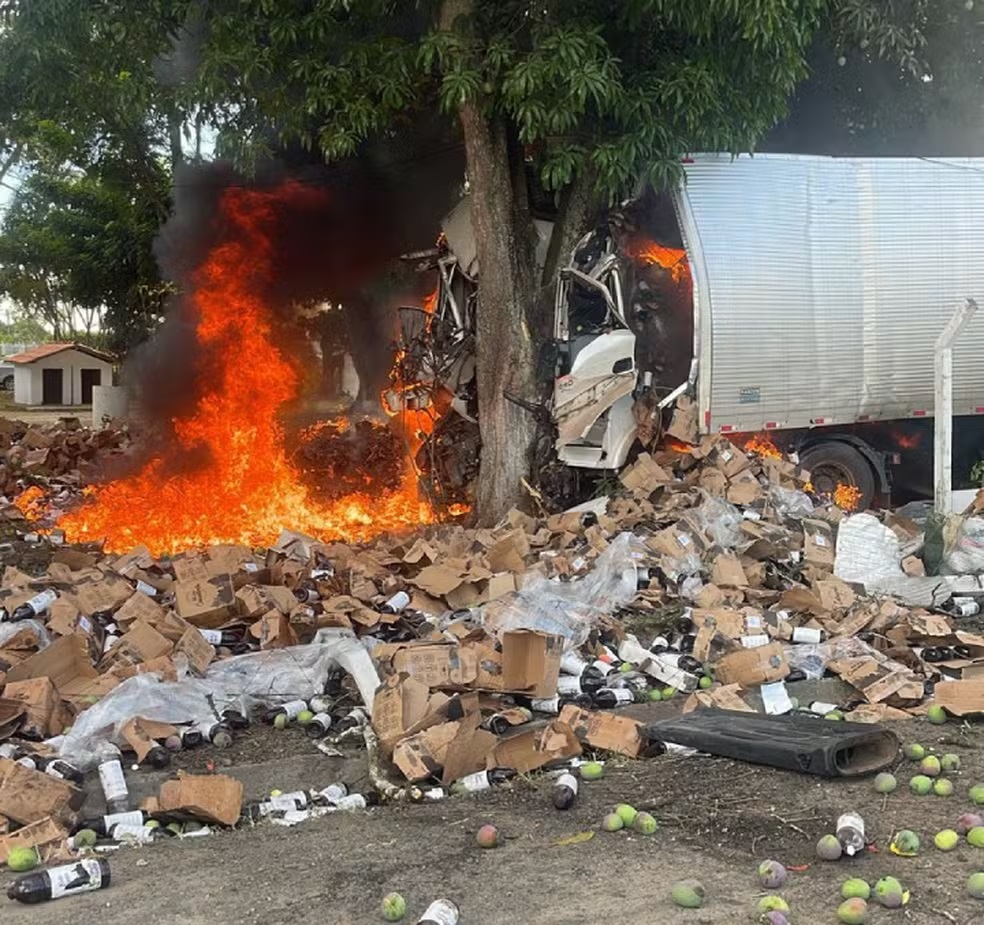 Em imagens que circulam nas redes sociais é possível ver o caminhão em chamas e diversas caixas com garrafas de suco de uva espalhadas pelo chão, assim como mangas. As garrafas eram transportadas no caminhão e as mangas caíram da árvore com o impacto da batida. A frente do veículo de carga ficou destruída.