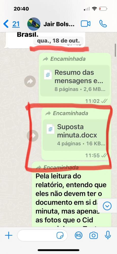 O envio da suposta minuta ao celular de Bolsonaro foi feito no dia 18 de outubro de 2023. Veja no print abaixo.