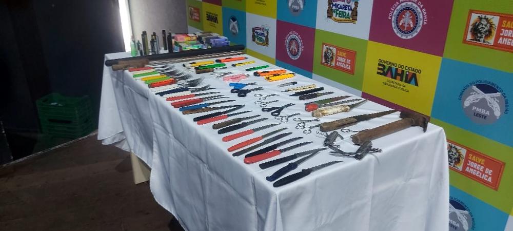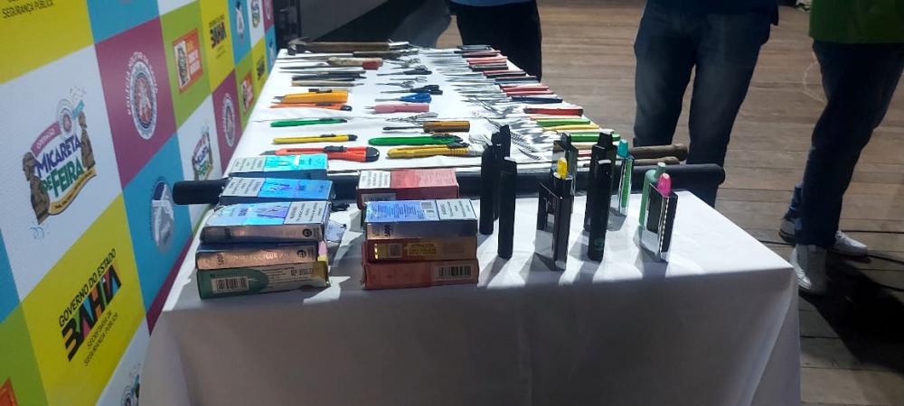 Foram apreendidos facas, cigarro eletrônico, tesouras, estilete e até mesmo martelo e um bastão. “São diversos materiais que tiramos de circulação nesse trabalho preventivo da PM para evitar que tenhamos alguma ocorrência no circuito”.