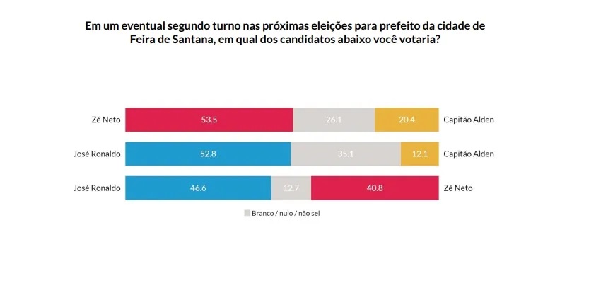 Em um eventual 2º turno, José Ronaldo levaria vantagem sobre Zé Neto, com 46,6% dos votos contra 40,8% do petista, mas ainda no limite da margem de erro, de três pontos percentuais. As configurações de 1º e 2º turnos, apesar de parecidas, revelam cenários e possibilidades diferentes, segundo o cientista político Andrei Roman, executivo-chefe da AtlasIntel.