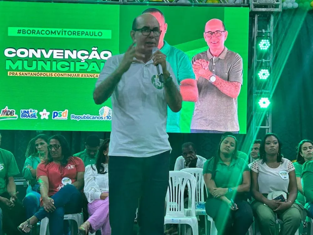 O nome de Vitor do Posto foi confirmado, neste domingo (5), como o candidato a reeleição para prefeito da cidade de Santanópolis. A convenção aconteceu a tarde, às 15h15, na quadra da Escola Maria Elizabete. Os partidos que fazem parte da coligação de Vitor são o MDB, União Brasil, PT, PSD e Republicanos com 42 candidatos a vereadores e vereadoras. Paulo Ribeiro continua sendo o vice de Vitor.