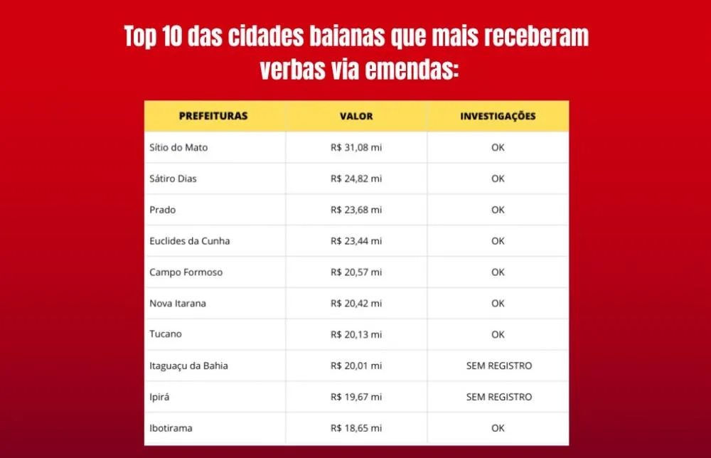 Confira abaixo o top 10 das cidades baianas que mais receberam verbas via emendas, excluindo Camaçari e Coração de Maria: