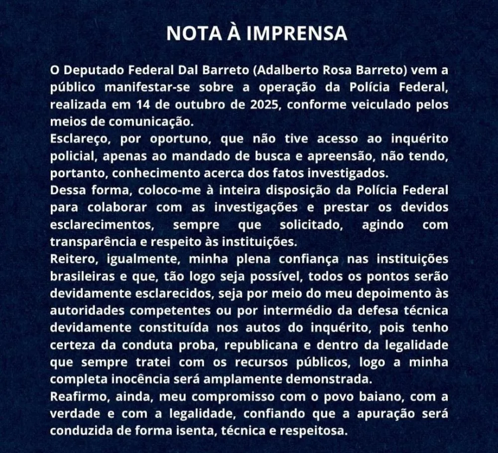 O deputado federal Dal Barreto (Adalberto Rosa Barreto) divulgou uma nota à imprensa nesta terça-feira (14) para comentar a operação da Polícia Federal, que teve como alvo sua residência e foi amplamente noticiada pelos meios de comunicação.