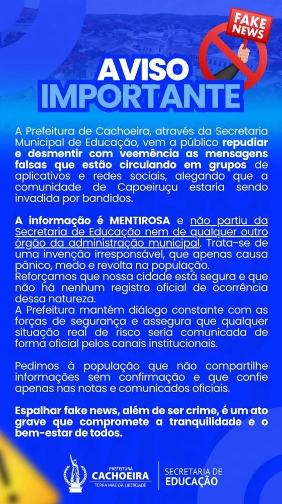 A Prefeitura de Cachoeira, através da Secretaria Municipal de Educação, divulgou uma nota pública nesta quinta-feira (13) para desmentir informações falsas (fake news) que circulam em grupos de aplicativos e redes sociais. As notícias falsas dizem que a comunidade de Capoeiruçu estaria sendo invadida por bandidos.