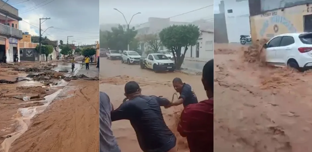 Vídeos compartilhados nas redes sociais também mostram ruas alagadas, com água atingindo a altura dos portões de residências. Em uma das gravações, moradores formam uma corrente humana para resgatar uma motocicleta arrastada pela enxurrada.