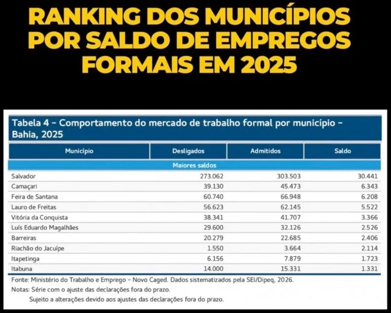 O município de Riachão do Jacuípe tem se consolidado como um dos principais polos de geração de emprego na Bahia em 2025, impulsionado pelo elevado número de admissões formais ao longo do ano. De acordo com dados recentes, a cidade ultrapassou a marca de 3.600 contratações, desempenho que a colocou na 8ª posição entre os municípios baianos que mais geraram empregos.