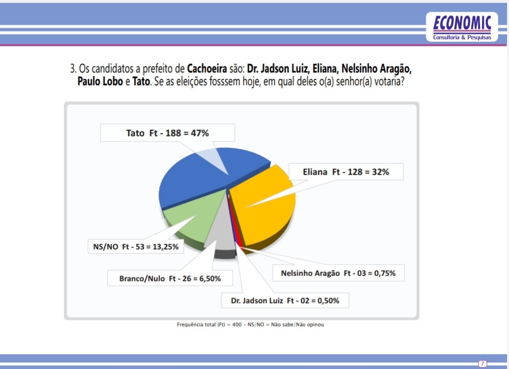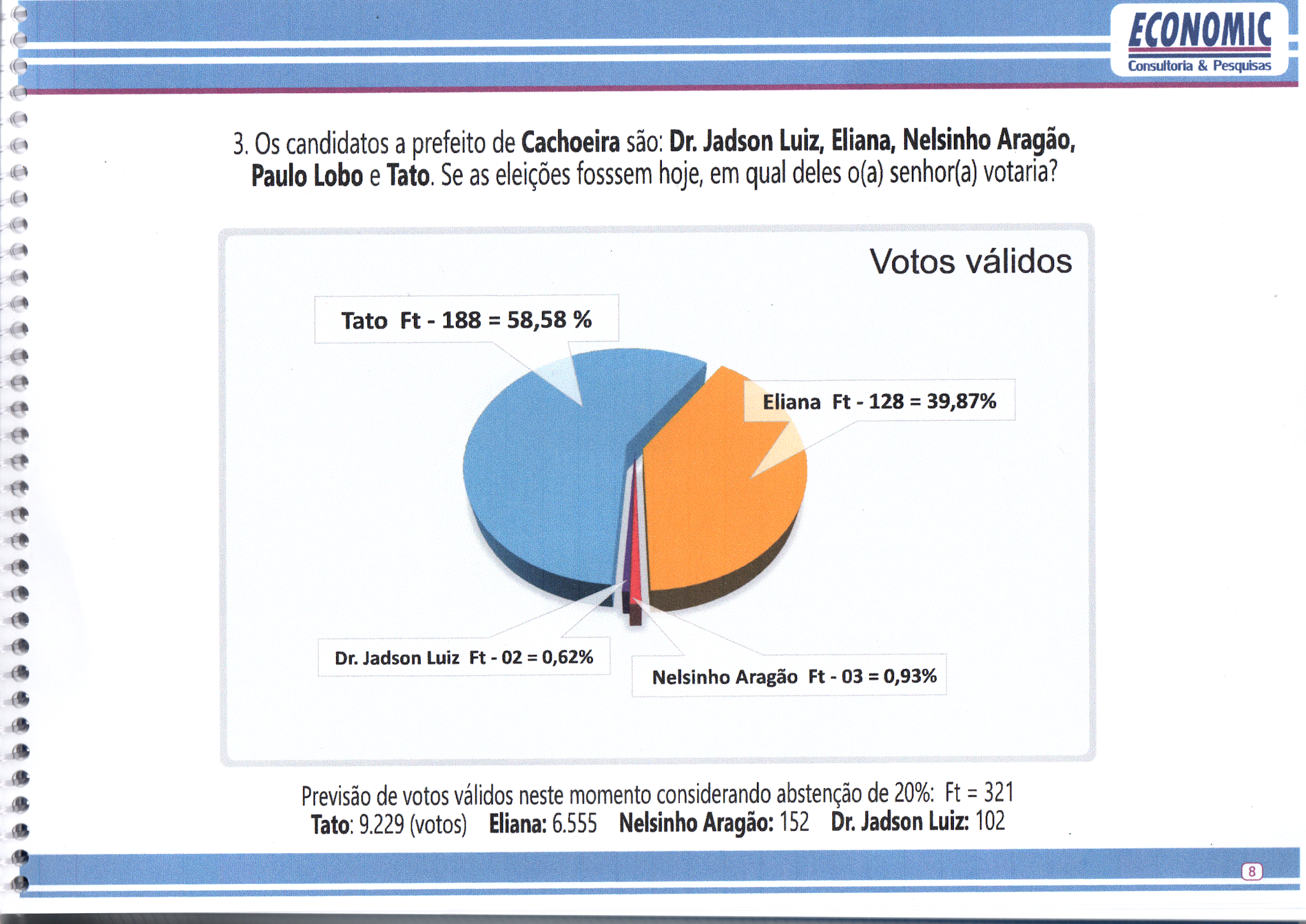 O prefeito Tato Pereira (PSD), candidato à reeleição, lidera as intenções de voto na disputa pela prefeitura de Cachoeira, com 47%, conforme pesquisa realizada pelo instituto Economic. Já a candidata Eliana Gonzaga (PRB), aparece em segundo, com 32%. Ela é seguida por Dr. Nelsinho Aragão (Rede) tem 0,75%. Na sequência, Dr. Jadson Luiz (Avante) que pontua com 0,50% e Dr. Paulo Lobo (DC), não pontuou. Não souberam ou não opinaram são 13,25% e brancos e nulos totalizaram 6,50%.