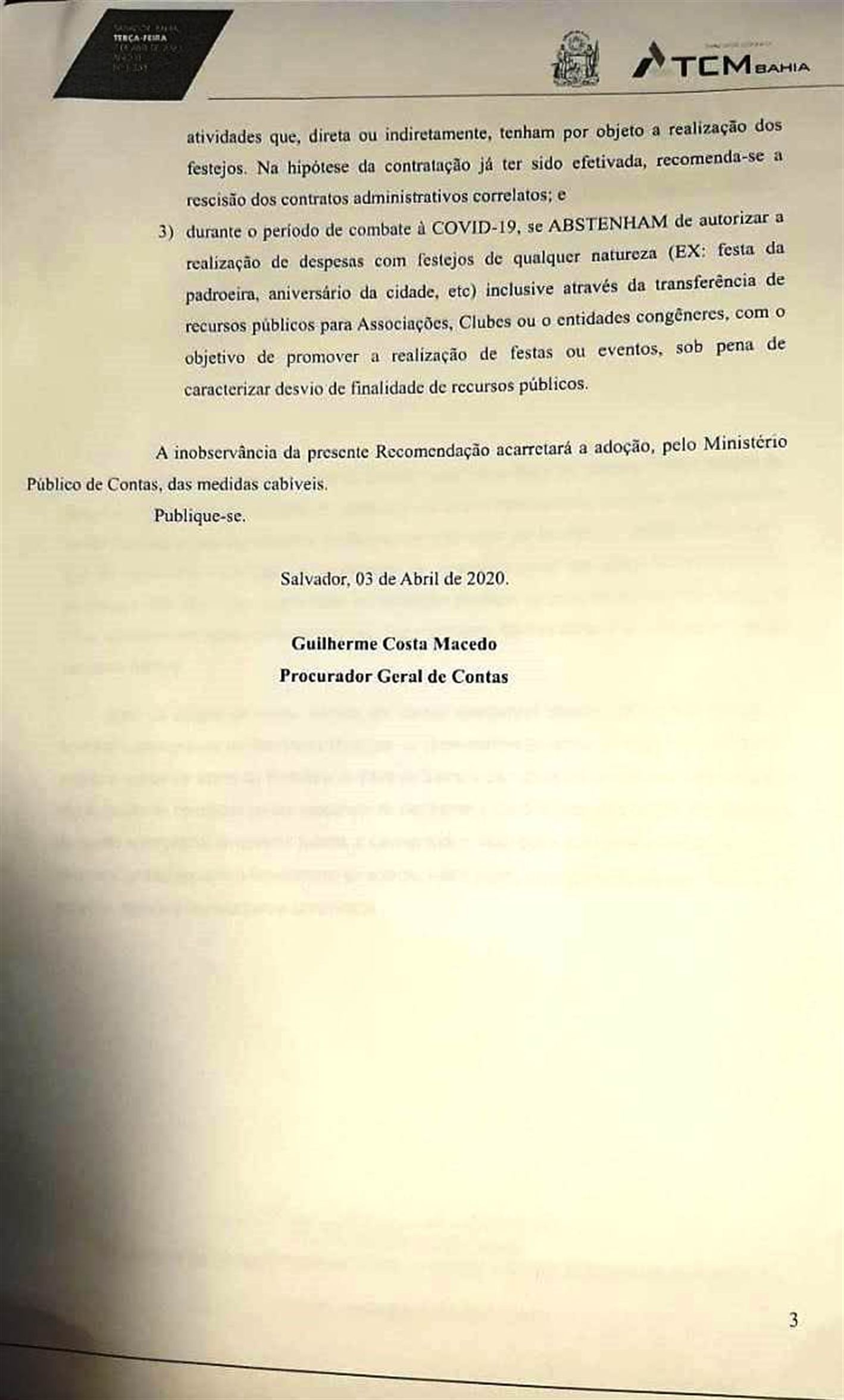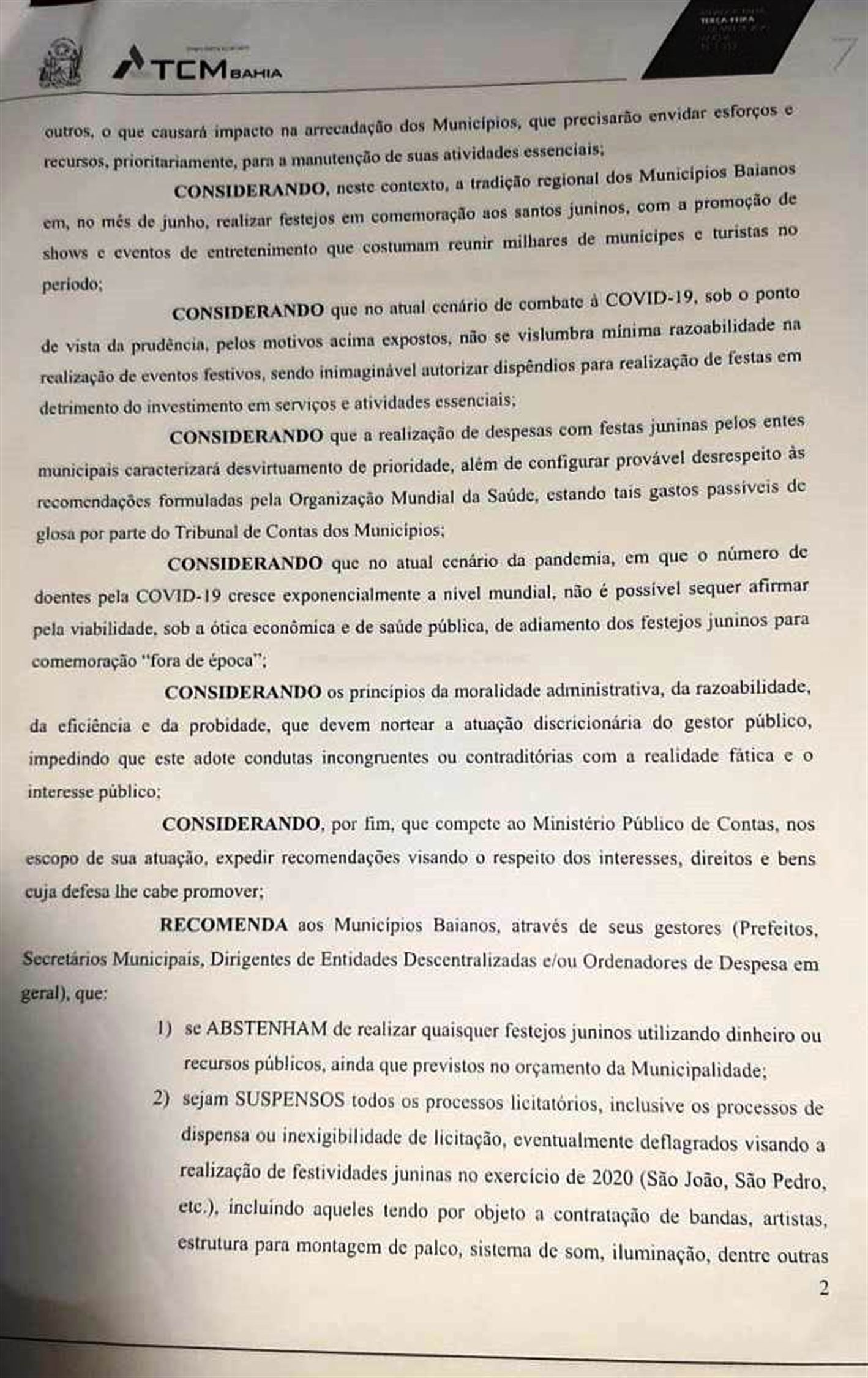 “Durante o combate à COVID-19, se ABSTENHAM de autorizar a realização de despesas com festejos de qualquer natureza (EX: festa da padroeira, aniversário da cidade etc) inclusive através de transferência de recursos públicos para associações, clubes ou entidades congêneres, com o objetivo de promover e realização de festas ou eventos, sob pena de caracterizar desvio de finalidade de recursos públicos”.