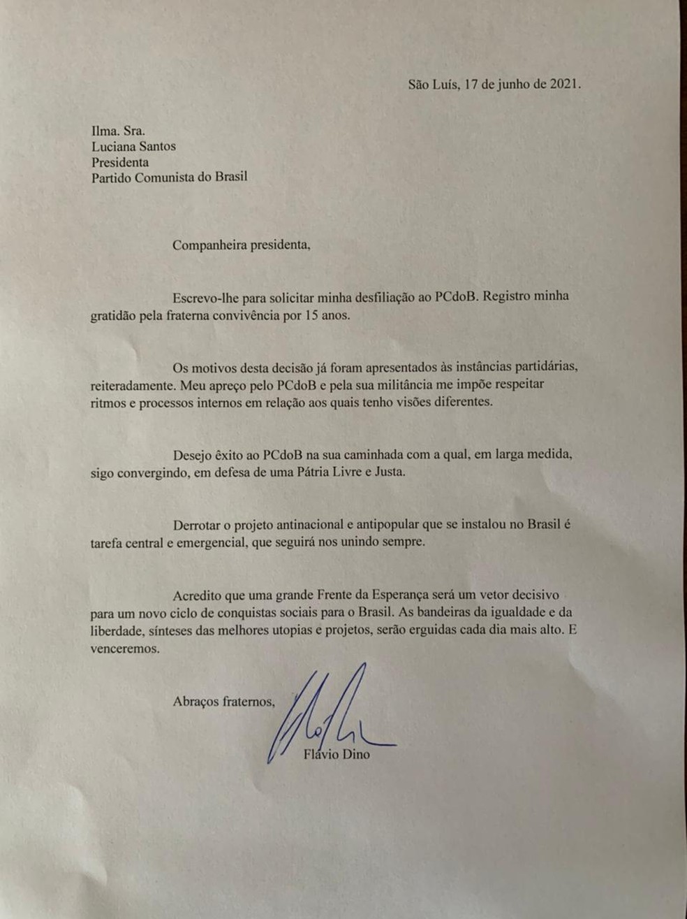 “Informo que pedi desfiliação ao PCdoB. Desejo êxito ao Partido na sua caminhada em defesa de uma Pátria Livre e Justa. Uma grande Frente da Esperança é um vetor decisivo para um novo ciclo de conquistas sociais para o Brasil. A tal tarefa seguirei me dedicando”, declarou Flávio Dino.