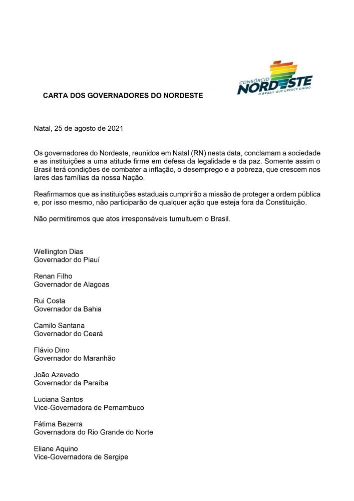 “Reafirmamos que as instituições estaduais cumprirão a missão de proteger a ordem pública e, por isso mesmo, não participarão de qualquer ação que esteja fora da Constituição. Não permitiremos que atos irresponsáveis tumultuem o Brasil”, ressalta o texto assinado por sete governadores - Wellington Dias (Piauí), Renan Filho (Alagoas), Rui Costa (Bahia), Camilo Santana (Ceará), Flávio Dino (Maranhão), João Azevedo (Paraíba), Fátima Bezerra (Rio Grande do Norte) – e duas vice-governadoras: Luciana Santos (Pernambuco), e Eliane Aquino (Sergipe).
