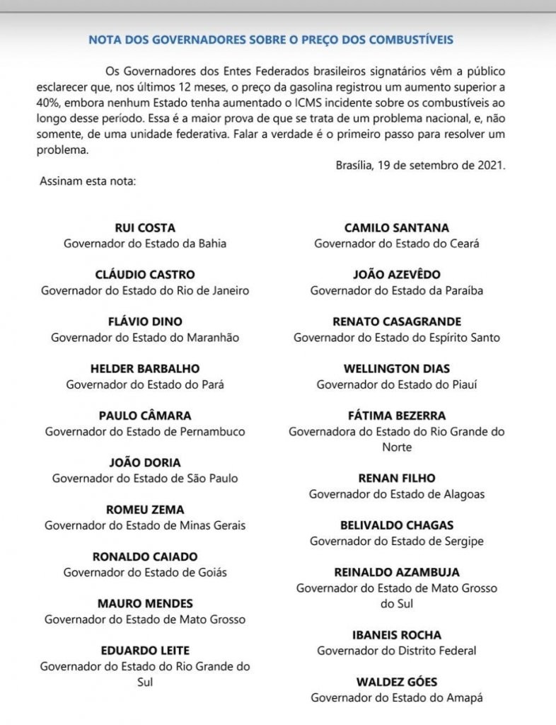 Apenas sete governadores não assinaram a carta: Antônio Denarium (PP/RR), Carlos Moisés (Sem Partido/SC), Gladson Cameli (PP/AC), Marcos Rocha (Sem Partido/RO), Mauro Carlesse (PSL/TO), Ratinho Júnior (PSD/PR) e Wilson Lima (PSC/AM).