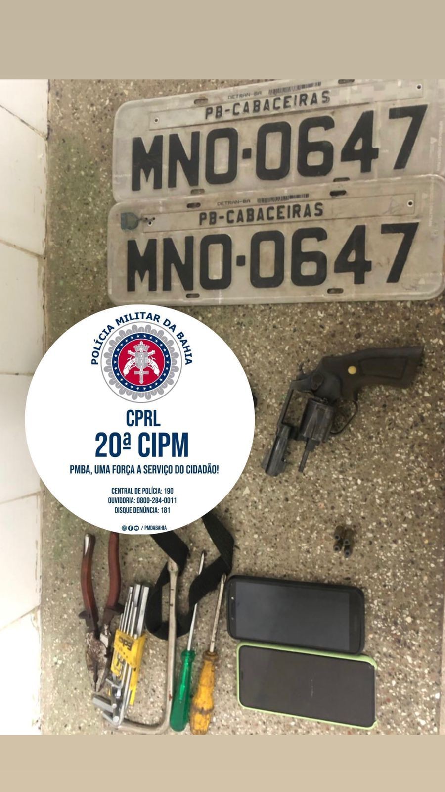 No momento em que ele passou, fazendo a rota de Jaíba foi realizada a abordagem. Em uma busca minuciosa, a Polícia Militar encontrou um revólver calibre 38 da marca Taurus, n° 111069 com quatro munições intactas, dois aparelhos celulares, uma placa veicular com a numeração MNO-0647 e licença de Cabaceiras , estado da Paraíba e diversas ferramentas.