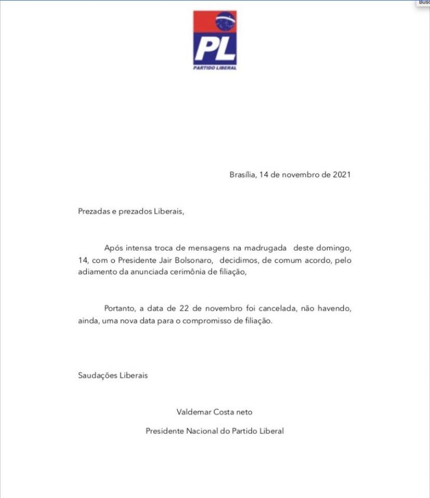 A direção do PL informou que "estuda outras datas para a realização do evento". A nota foi divulgada horas após Bolsonaro afirmar, durante viagem a Dubai, que ainda tem "muita coisa a conversar" com Valdemar e que o "casamento" com o PL poderia "atrasar um pouco".
