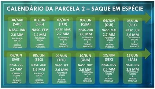Se o beneficiário resolver realizar o saque em espécie, o ministério estipulou um outro calendário, também escalonado por mês de aniversário, iniciando a partir do dia 30 de maio.