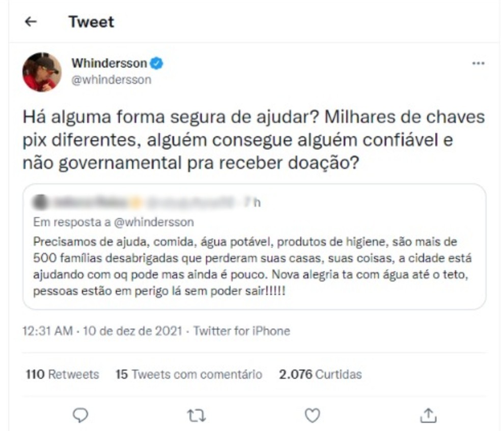 Quem também comentou sobre o assunto nas redes sociais foi o humorista piauiense Whindersson Nunes. Em uma publicação feita no Twitter, o influenciador pergunta o que aconteceu no extremo sul da Bahia e como pode ajudar.