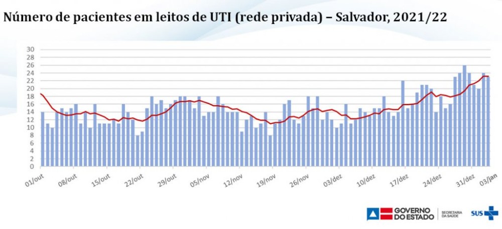 Ainda segundo a secretaria, o monitoramento diário tem demonstrado que a tendência de crescimento se acentuou após o Natal e o Réveillon. O aumento se deu tanto na rede pública do estado, quanto na rede privada de Salvador.