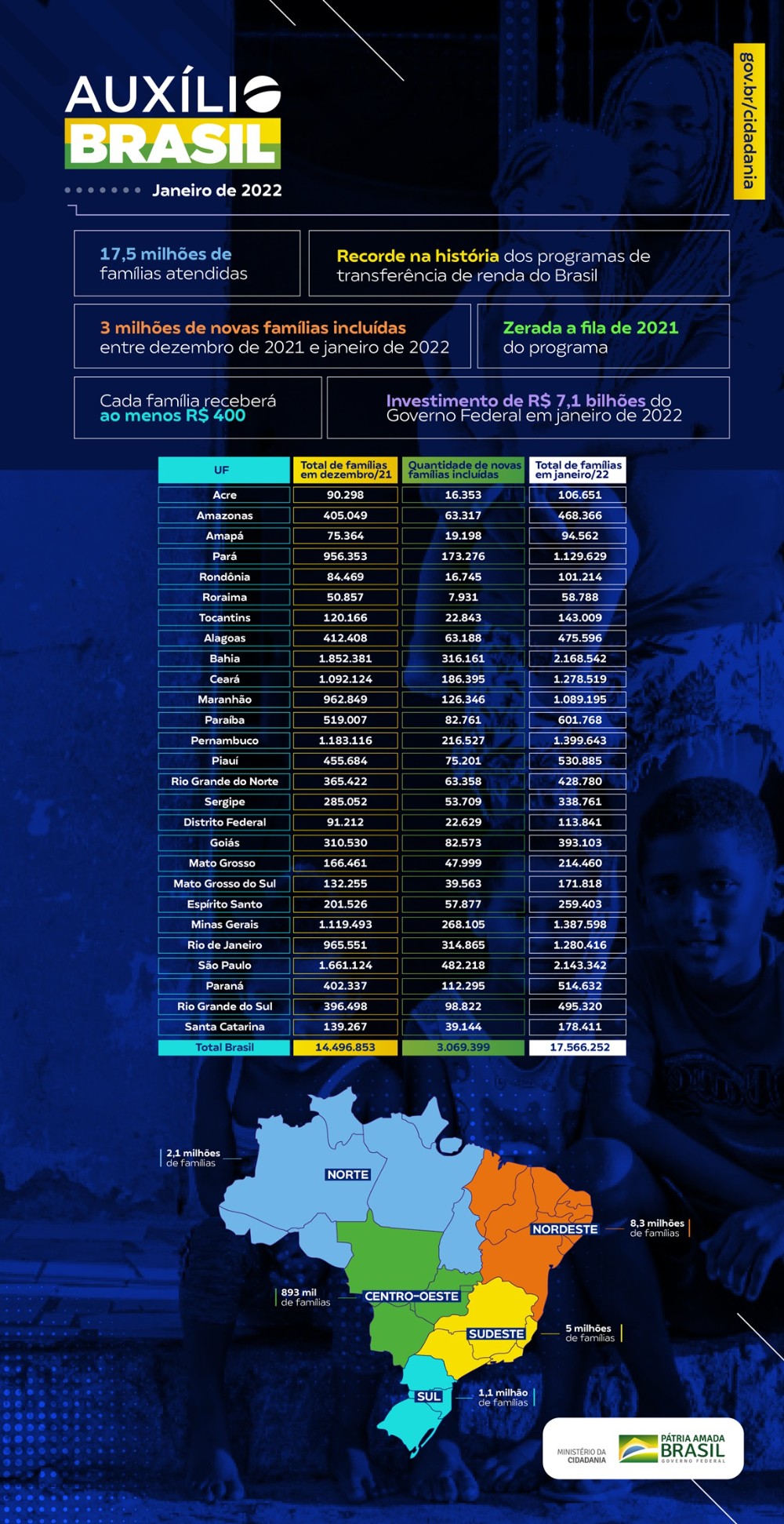 O Auxílio Brasil chega em janeiro de 2022 a um patamar inédito no país. O Governo Federal, por meio do Ministério da Cidadania, incluiu três milhões de novas famílias na folha de pagamento e zerou a fila de elegíveis de 2021, passando a atender um total de 17,5 milhões de famílias e alcançando, assim, o maior número de beneficiários da história dos programas de transferência de renda. Cada família receberá um repasse mínimo de R$ 400. O investimento total para os pagamentos supera R$ 7,1 bilhões.